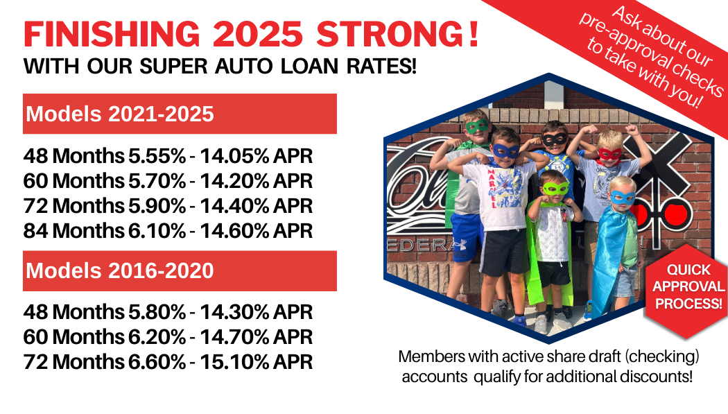 Finishing 2025 Strong! with our Super Auto Loan Rates!  List of rates with image of kids dressed up as super heroes in front of the Cliinchfield logo.